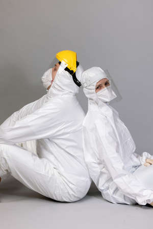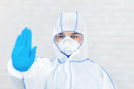 A human epidemiologist in a disposable anti-epidemic antibacterial isolation suit shows hand gestures on a white background. Epidemic and medical concept.