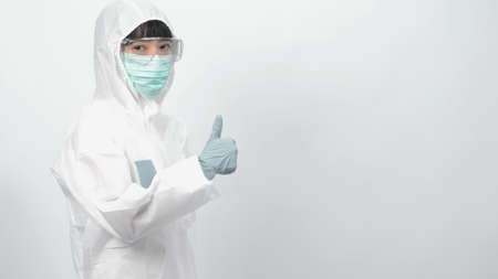 Woman doctor in PPE or personal protection equipment suit and medical mask and glove for protect corona virus or covid-19 and studio shot on white background and copy space