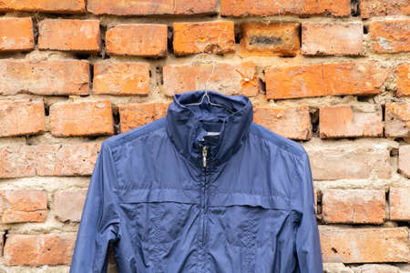 blue womens jacket weighs on hangers on the wall at home outdoors, womens jacket fashion