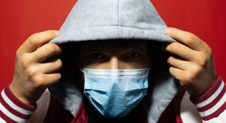 Portrait of young hooded man wearing medical flu mask, protection from coronavirus. On background of red color.