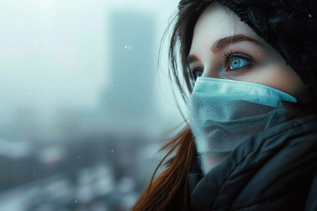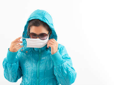 Woman wearing a winter jacket and a face protection mask