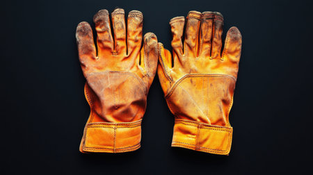 This image features a pair of worn leather work gloves laid out against a dark background. The gloves exhibit unique textures and details, ideal for industrial and craft themes.