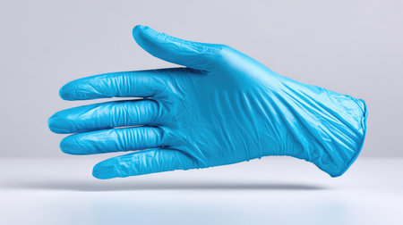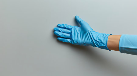 A gloved hand reaching out against a plain background, symbolizing safety, healthcare, and protective measures