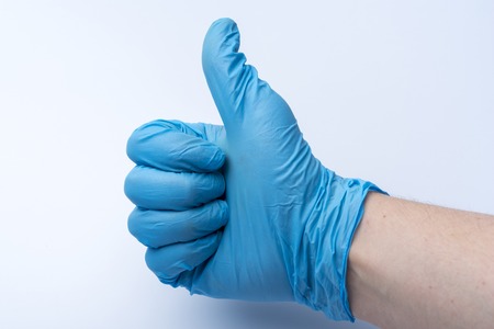 Hand in blue glove isolated on white with thumb up.