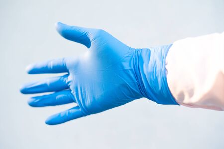 Hand put blue glove on white background medical science concept.