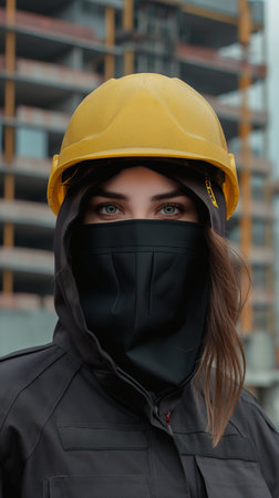 Portrait of a female construction worker in a protective mask and yellow helmet.