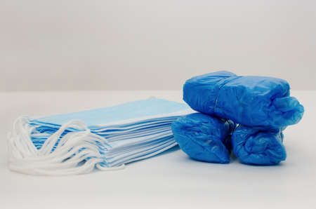 Corona virus prevention face masks at home. Medical respiratory bandage face on white background. Wearing requires. Selective focus