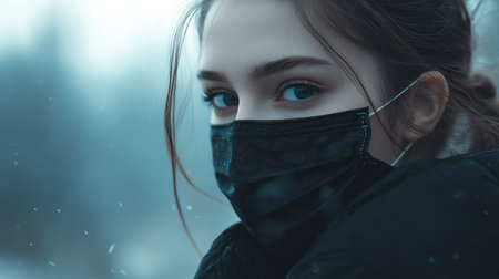beautiful woman in black medical mask, protection against illness, coronavirus