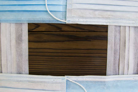 Collection of surgical masks lay flat on a dark wooden tabletop close-up photograph, the concept of virus prevention.