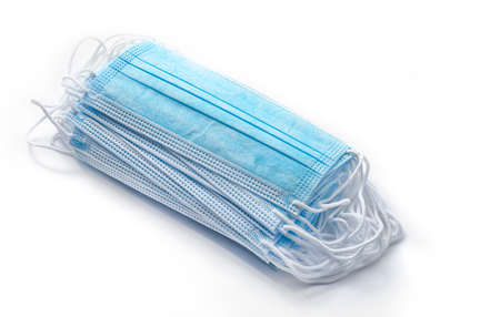 Bunch of fifty blue surgeon masks, used for covid 19. Against contagious virus and pollution. White background