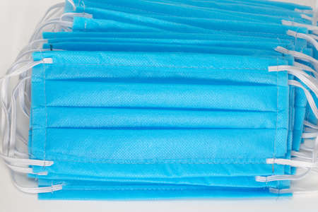 Big stack of blue medical face mask with white rope strap for protective coronavirus COVID-19