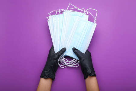 Blue surgical protective masks on a purple background. Coronavirus (COVID-19) hysteria is leading to mass mask shortages in the beginning of 2020.