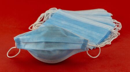 Many protective masks against pandemic and viruses lie on a red background.