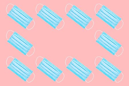 many blue medical face masks isolated on a pink background. copy space. flat lay. concept of protection against viruses, bacteria. background for medical subjects