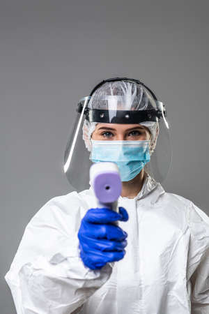 Young woman in a protective suit and blue gloves with an infrared thermometer. The girl measures the temperature towards the camera on a white background