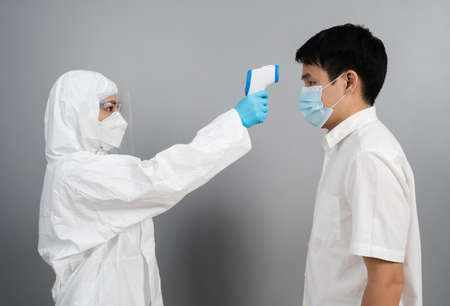 doctor in protective PPE suit using infrared thermometer measuring temperature with people, IR Thermoscan