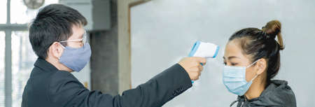 Asian woman foreman scanning fever temperature with digital thermometer to her staff worker wearing hygiene face mask protect