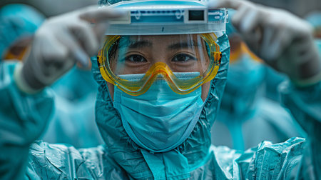 close-up-a portrait of an attractive young female researcher or PCR lab worker in a protective suit, helmet, and respirator.