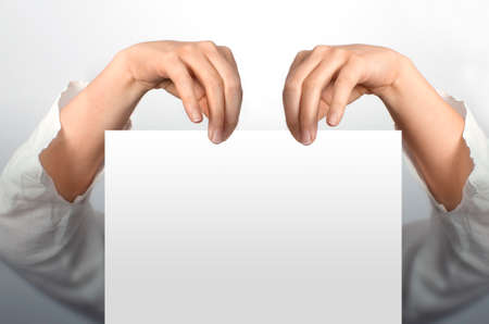 Paper sheet in the hands of a young person. Close-up. Space for lettering and design
