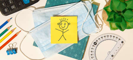 Back to school concept. Reminder to bring a protective mask against coronavirus.