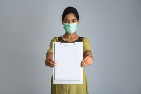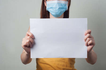 Young woman in medical mask and gloves showing empty blank paper in her hands. Focus on a piece of paper. Woman on blue background