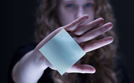 In the female hand there is a white card, inside the card there is a red frame and a text box. Black background of the picture