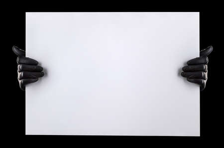 Hand in black gloves showing or holding blank cardboard isolated on black