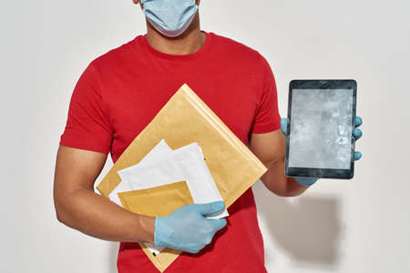Close up shot of delivery man wearing protective gloves holding parcels and letters, showing tablet pc to camera, standing isolated over light gray background