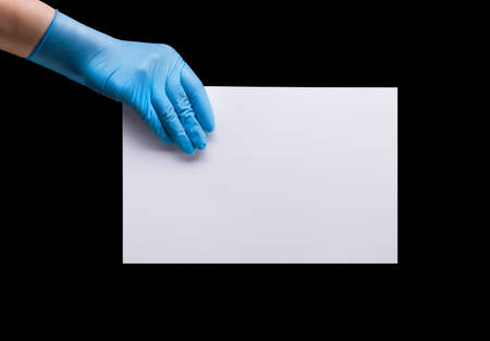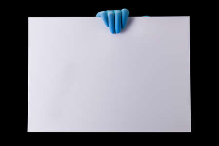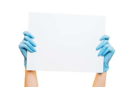 Woman hands in protective gloves hold a white blank poster.
