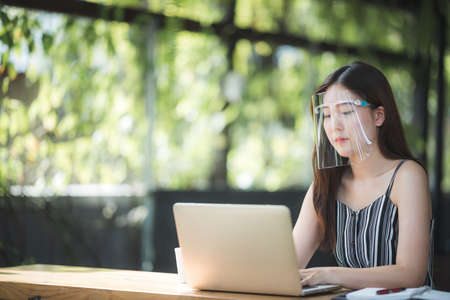 young asian woman wearing surgical face shield for protection virus disease, pandemic healthy safety