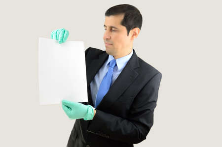 businessman holding a document with gloves over a white background