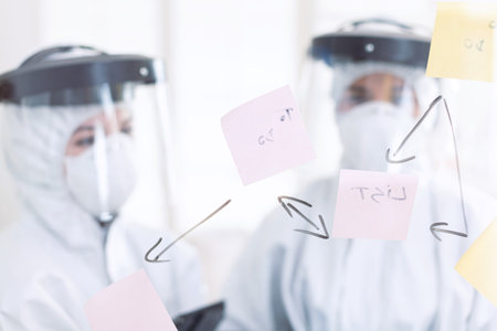 Stomatologs dressed in ppe suit during covid-19 as safety precaution. Medical team in stomatology office wearing coverall in dental office writing ideas on sticky notes.