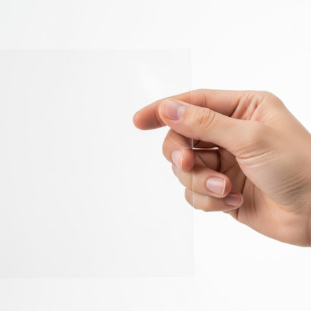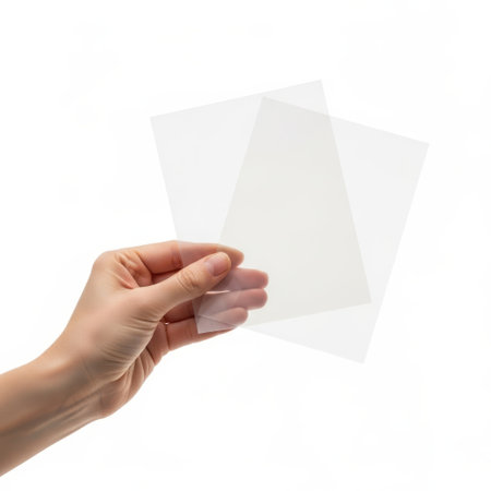 Hand holding transparent sheets isolated on white background