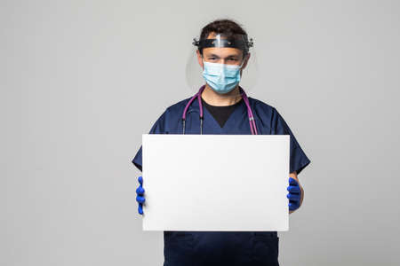 A man in a uniform and face mask holding a placard. Concept of healthcare and medicine.