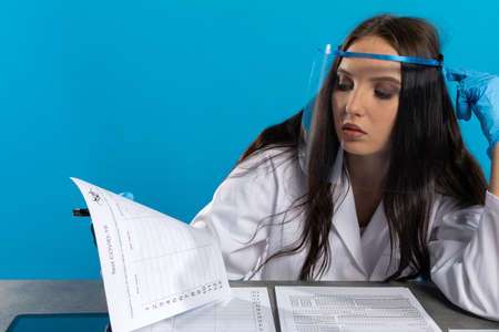 Medical staff holding report in personal protective equipment or PPE working on quarantine patient infected in during the epidemic crisis