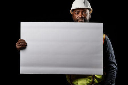 Construction worker holding a separate blank white panel isolated on black background. Generative AI.