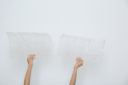Woman holding air conditioner filters near white wall, closeup