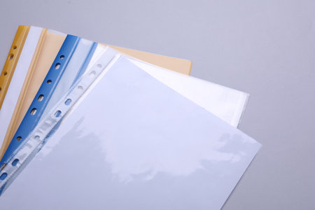 File folders with punched pockets and paper sheets on light gray background, above view