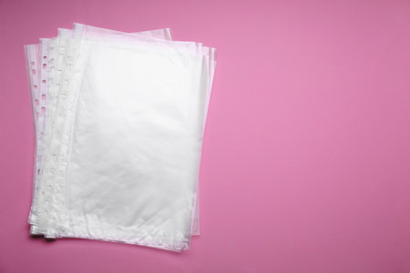 Punched pockets on pink background, flat lay. Space for text