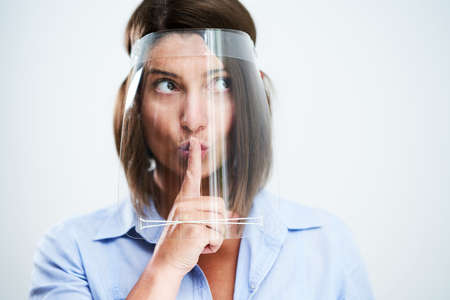 Woman wearing protection medical screen or plastic shield on her face, for corona virus or Covid-19 protection.