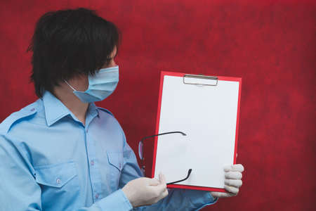 Hands in protective gloves holding white blank paper sheet on red background. template mock up. surface of leaflet. copy space
