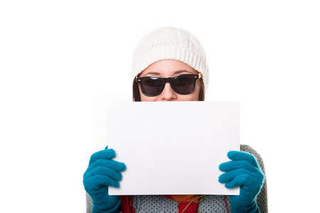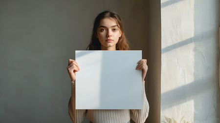 Portrait of a young woman holding a blank sheet of paper.