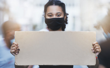 Activism, protest and girl with a poster with copy space in a street with face mask during pandemic. Portrait of human rights activist protesting with a empty sign for equality or justice in the city