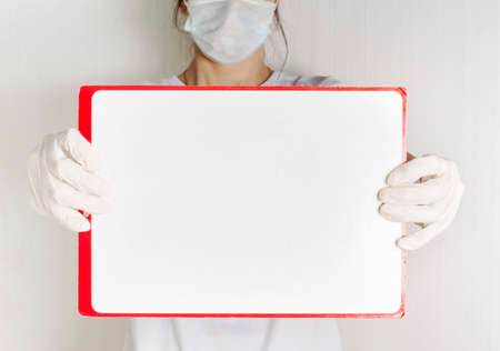 a girl in a mask and gloves holds an empty A4 poster on a light background.