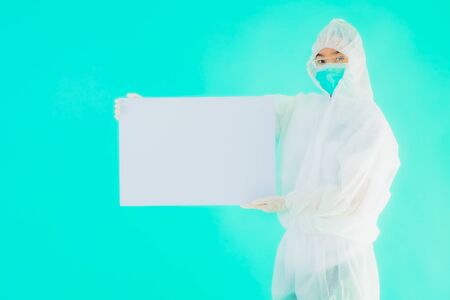 Portrait beautiful young asian doctor woman wear ppe or personal protective equipment for protect from coronavirus or covid19 with empty card white board on blue isolated background