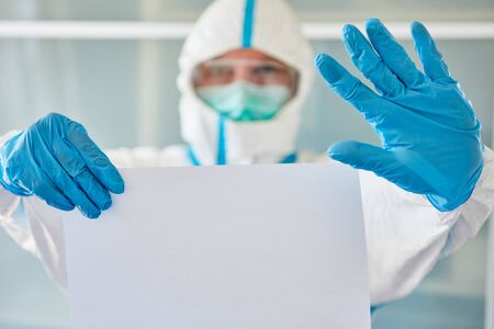 Disease control workers in protective clothing holding a blank sign with copy space due to Covid-19 pandemic