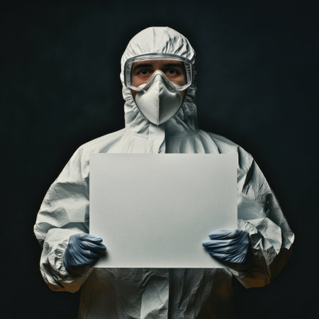 A man in a white suit holding a blank sign. The man is wearing a mask and gloves