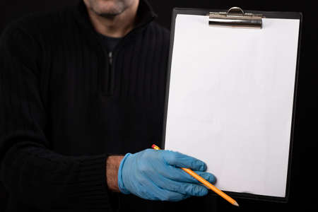A blank sheet of paper and a pencil held by a courier. Delivery of goods ordered with home delivery. Dark background.