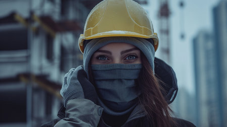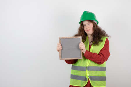 Portrait of young woman construction worker wearing safety helmet and coat.