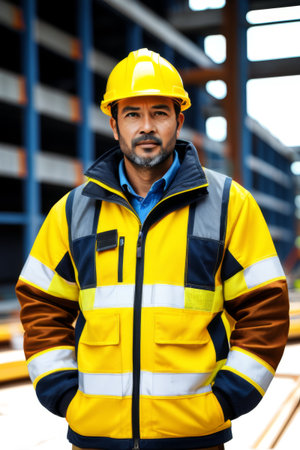 A man in an orange jacket and hard hat. AI generative image.